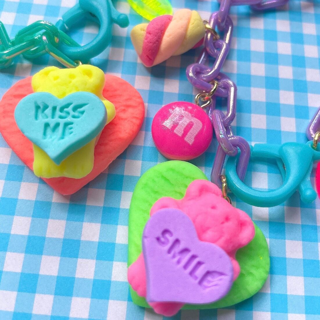 キャンディハーツを抱えたくまさんが乗った、ハートクッキーのバッグチャーム。