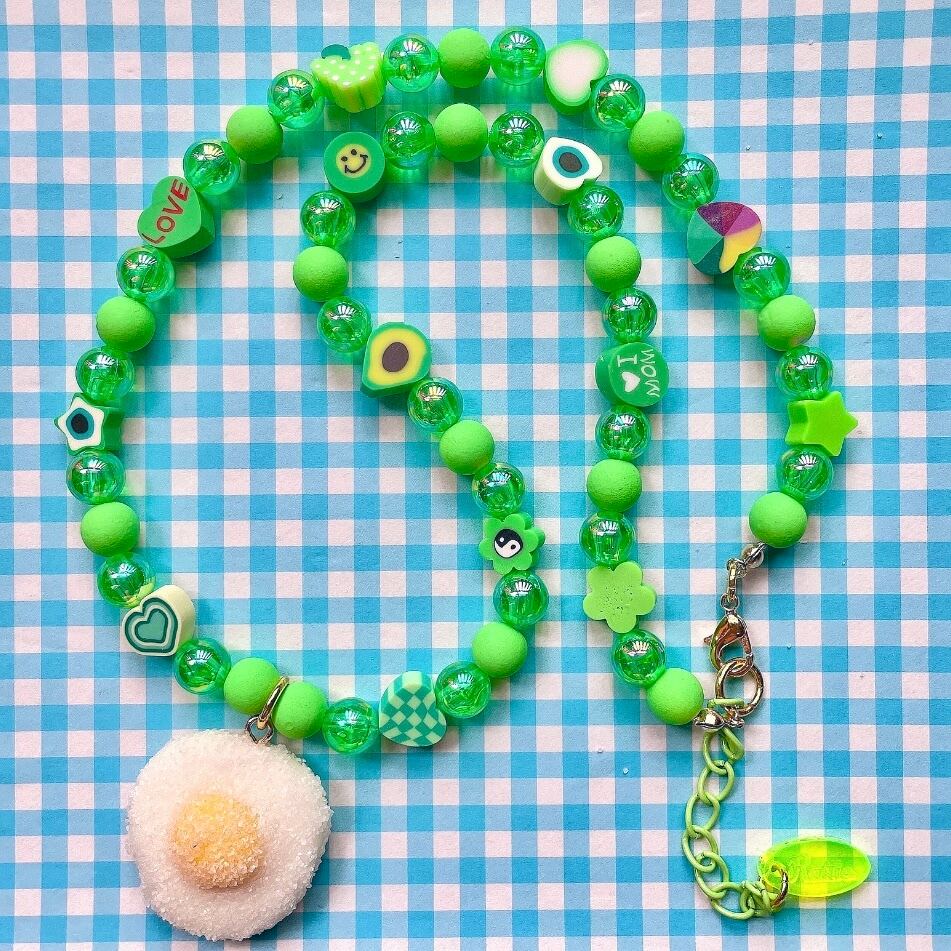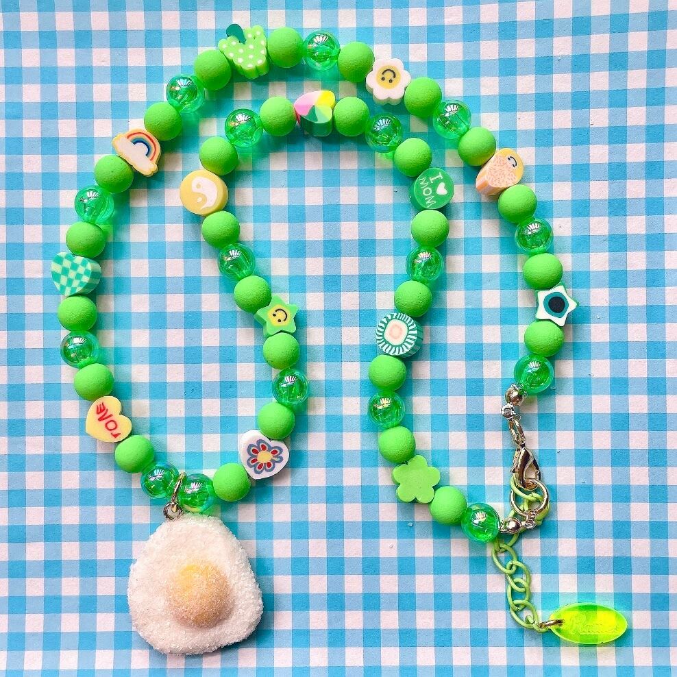 目玉焼きモチーフのシュガーグミが揺れるビーズネックレス。