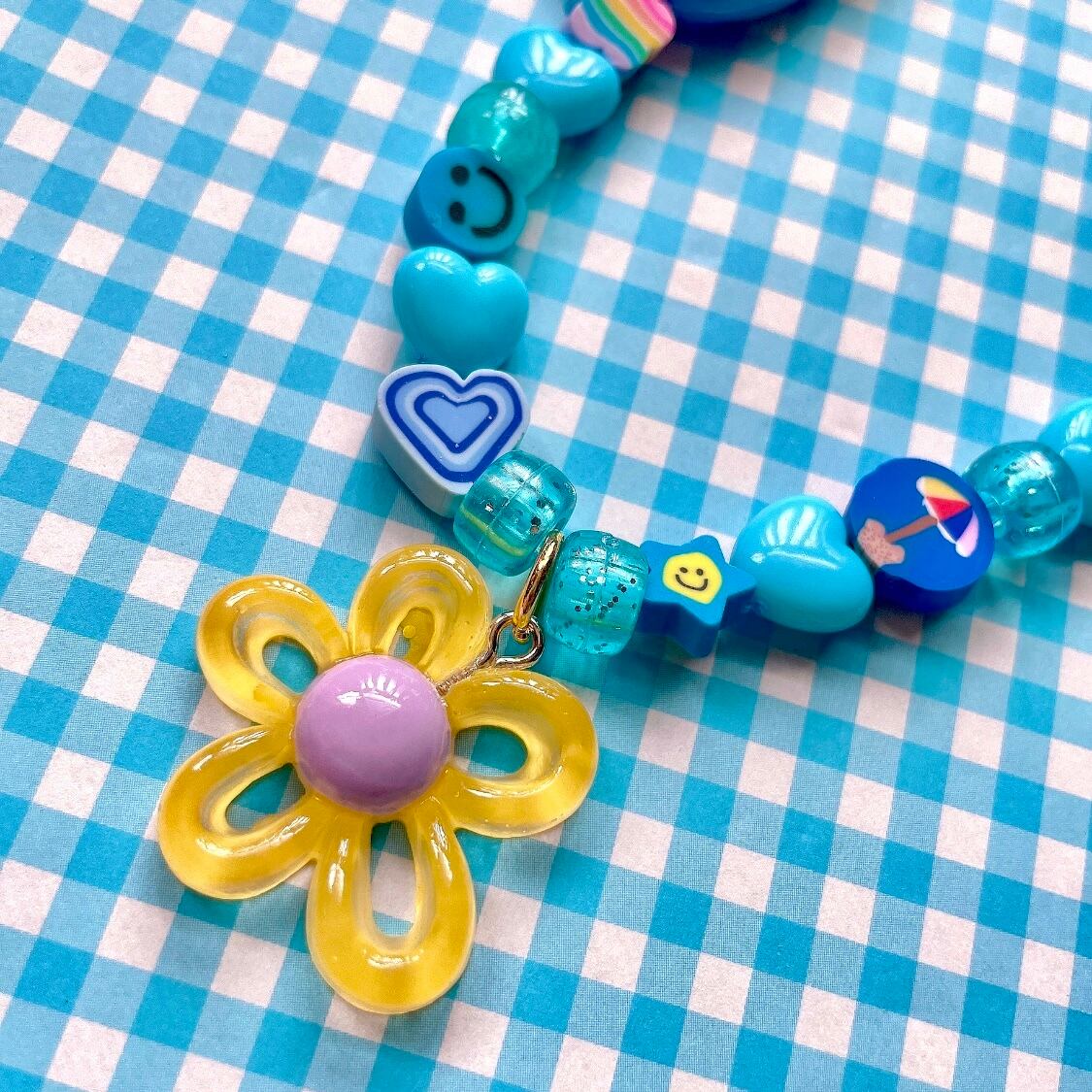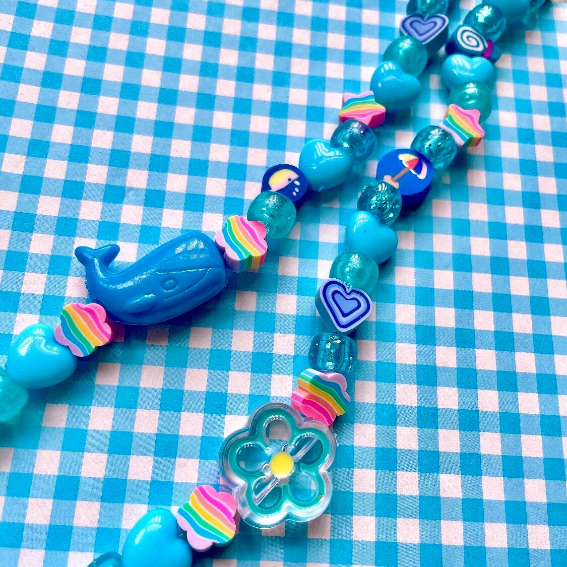 ブルーを基調としたアクリルビーズやクレイビーズを連ねました。
