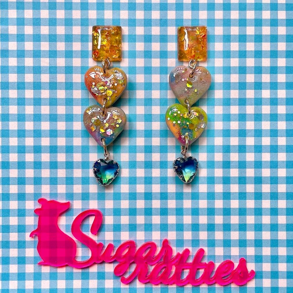 スクエア型のパーツに、マーブル模様の虹色ハートをふたつ、1番下には小ぶりストーンチャームを繋げたピアス。