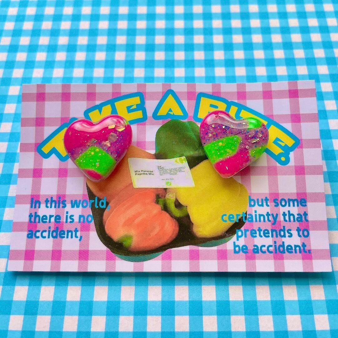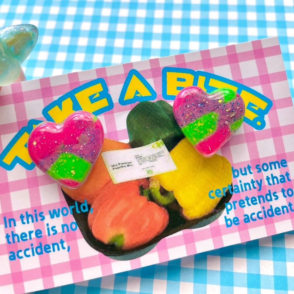 ラメを練りこんだピンク、グリーン、パープルの粘土を混ぜて作ったハートに、ゴールド系のホログラムラメを散らし、ぷっくり滑らかにレジンコーティングしました。