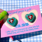 ベースのハートは2色のグリーンを練り混んだ粘土で、若干の透明感があり、レジンコーティングならではのちゅるんとした質感も魅力的です。
