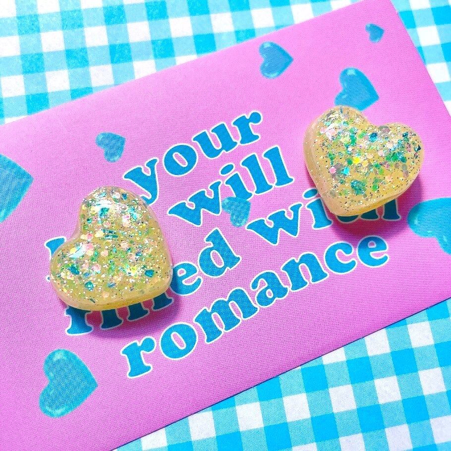 若干の透け感があるキャンディのようなハートにはラメを練り込み、表面にはホログラムラメを散らしました。