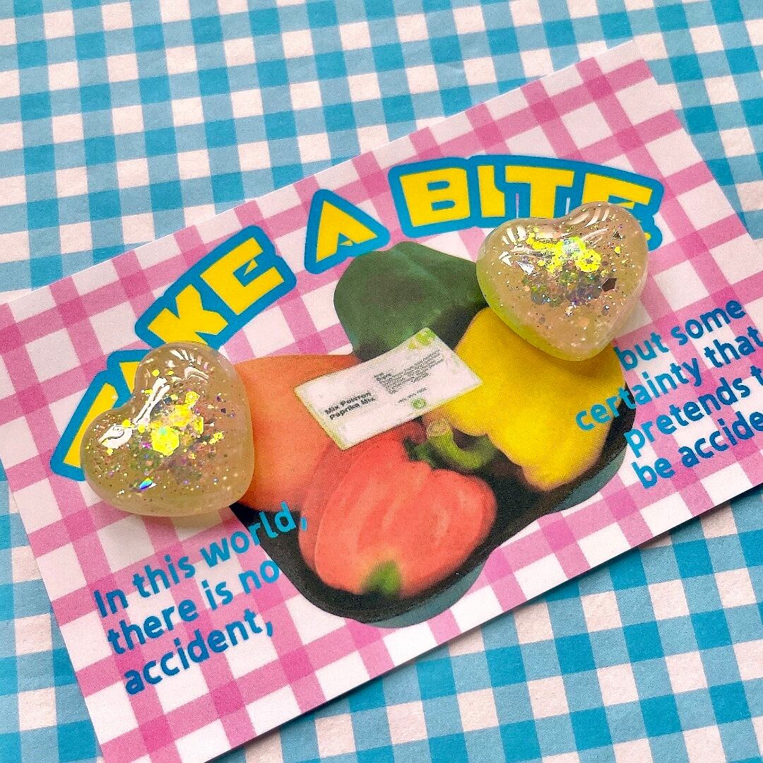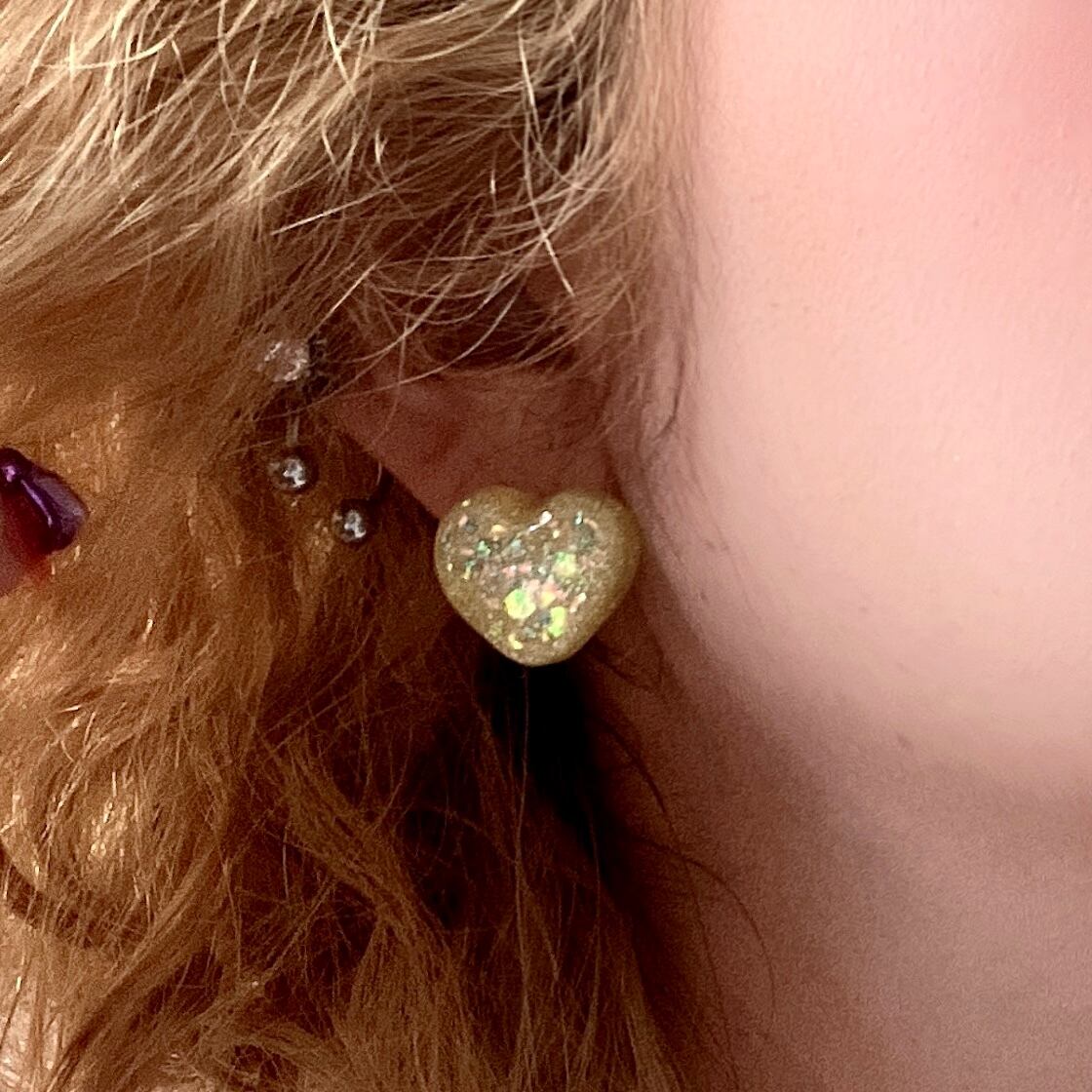 若干の透け感があるキャンディのようなハートにはラメを練り込み、表面には2種類のホログラムラメを散らしました。