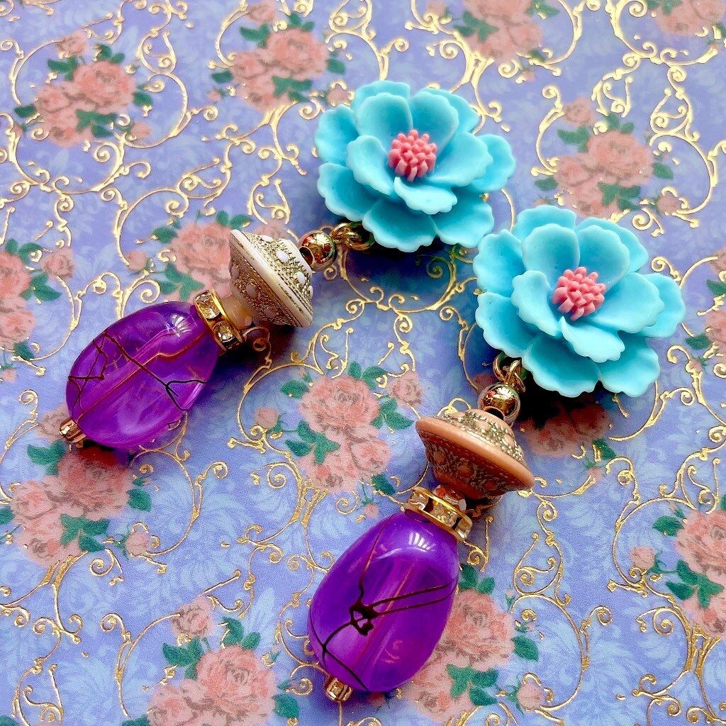 大輪の花にアクリルビーズが揺れる耳飾り。
