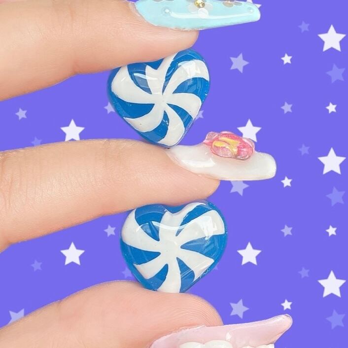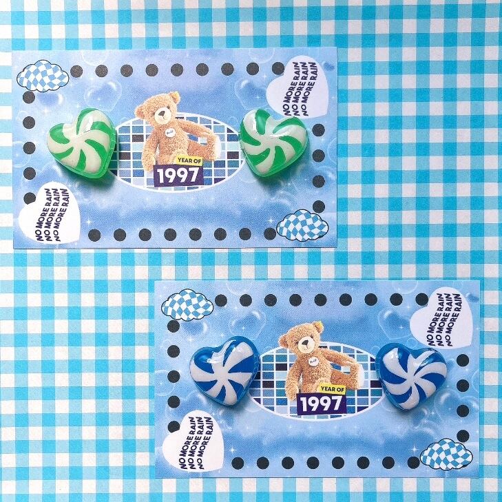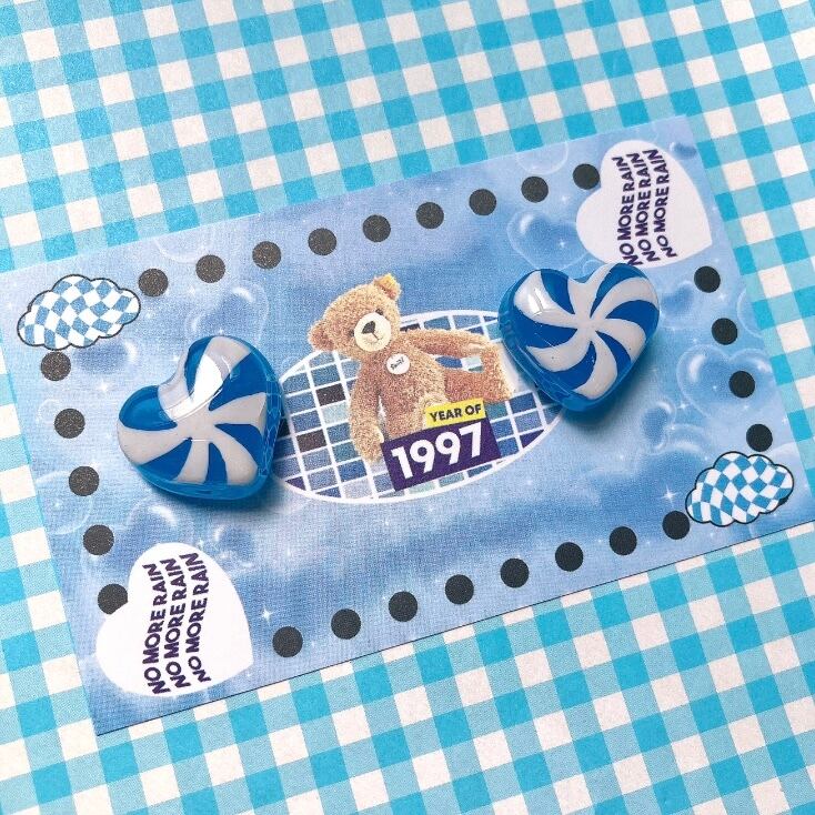透け感のある粘土にぐるぐるキャンディ模様を描いたHEARTピアスです♡