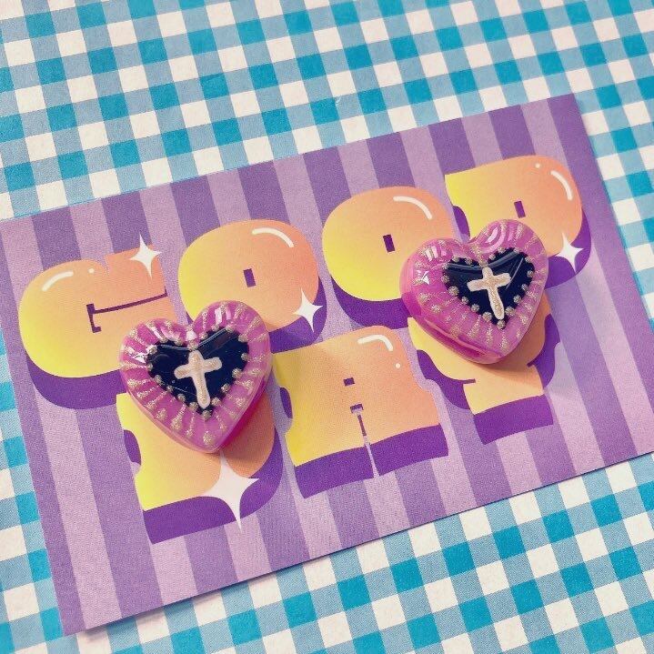 手描きならではの不揃いさは遠い外国のお土産感もあり、SUGAR RATTIESの甘くてポップな世界にオリエンタルなスパイスをひと振りしたような雰囲気があり、レジンコーティングならではのちゅるんとした質感も魅力的です。