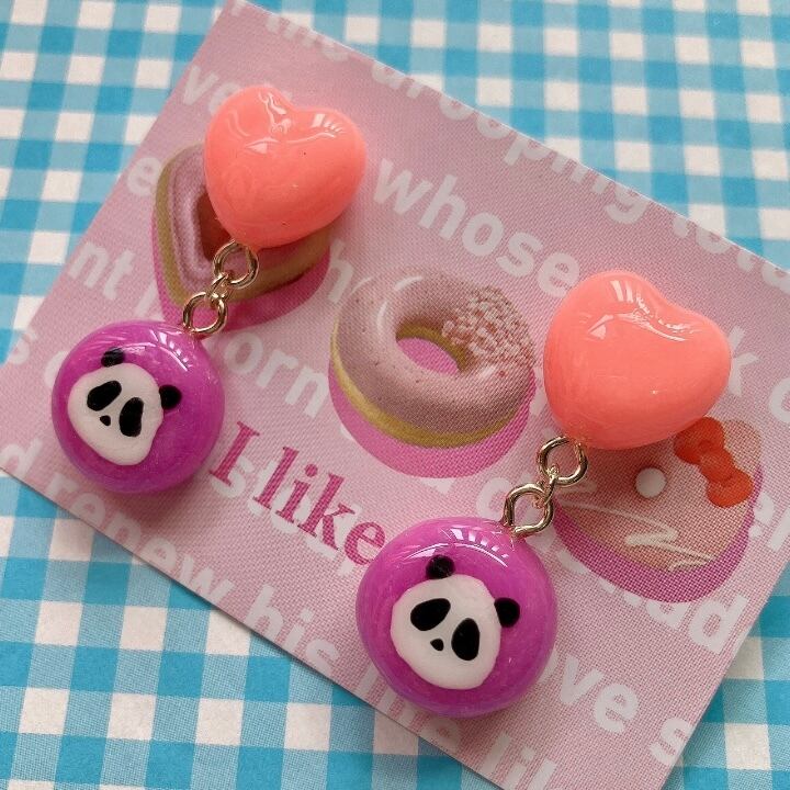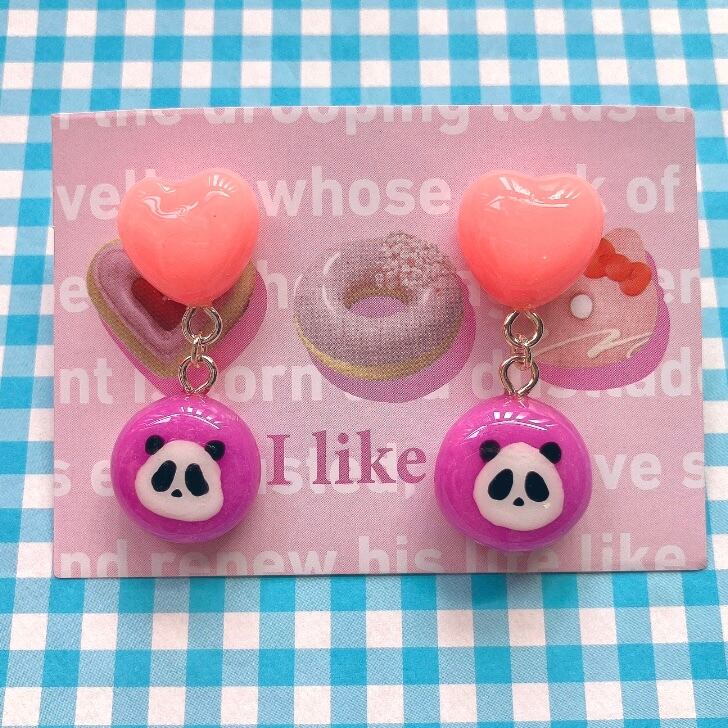 こちらはハートにぶら下げた揺れるタイプで、ハート、パンダの部分共に粘土でお作りしております。
