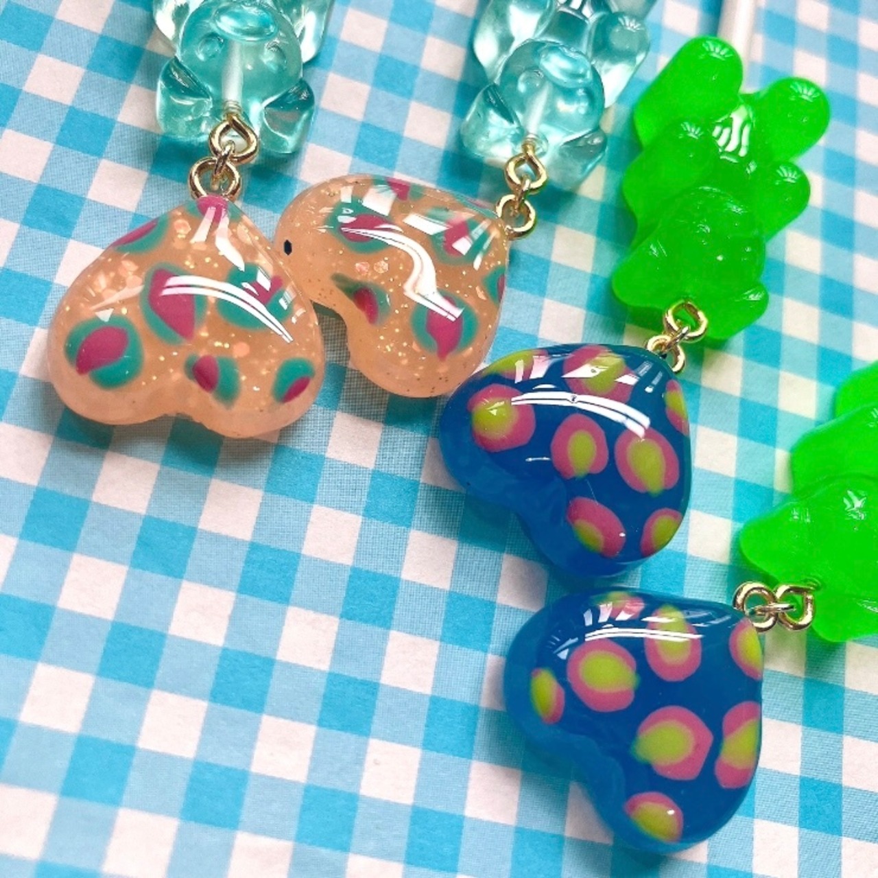 レオパード模様を描いた透け感あるオレンジ(ラメ入り)、ブルーのハートに、クリアカラーのグミベア風ロリポップキャンディが揺れ動きます♡
