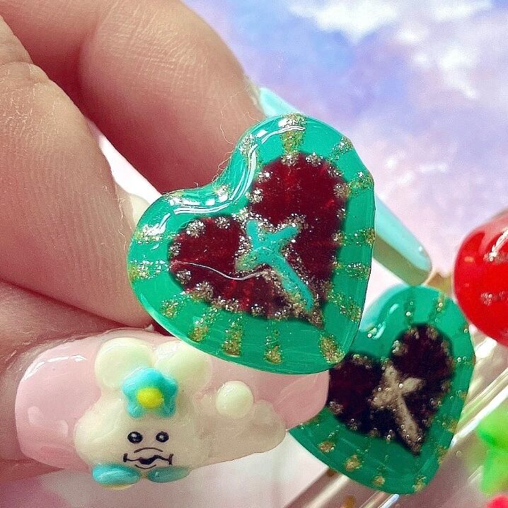 透け感あるベースにそれぞれのハートに合わせたカラーリングと、レジンコートによるちゅるんと艶やかな仕上がりとなっております。