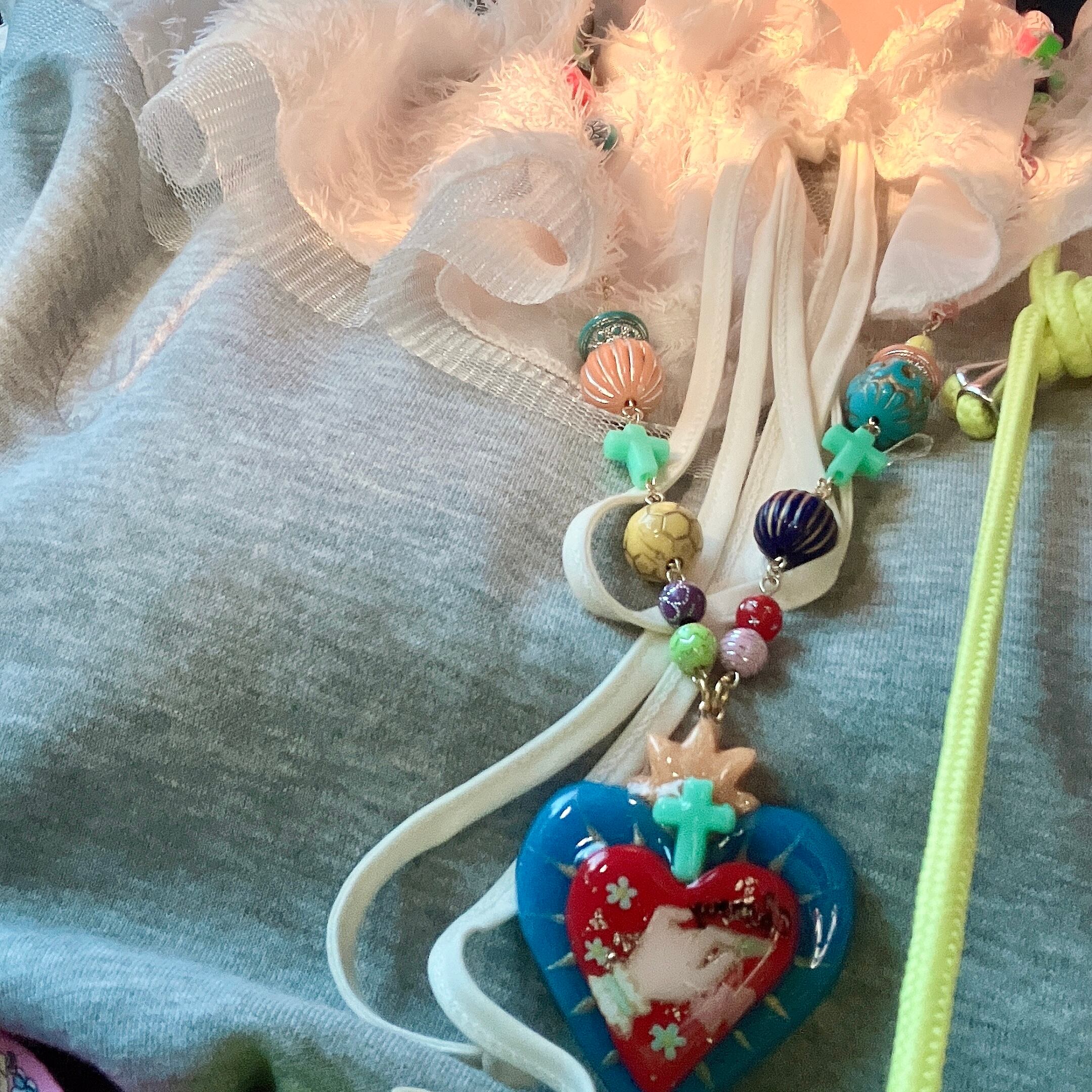 手描きペイントを施した、二枚重ねの粘土製ハートが揺れる、カラフルビーズのネックレス。