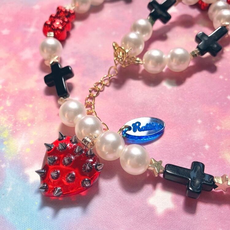 10mmパールにブラックの十字架、メタリックレッドのグミベアをミックスさせて、前作の王道な感じから抜け出し遊び心あるデザインで仕上げました。
