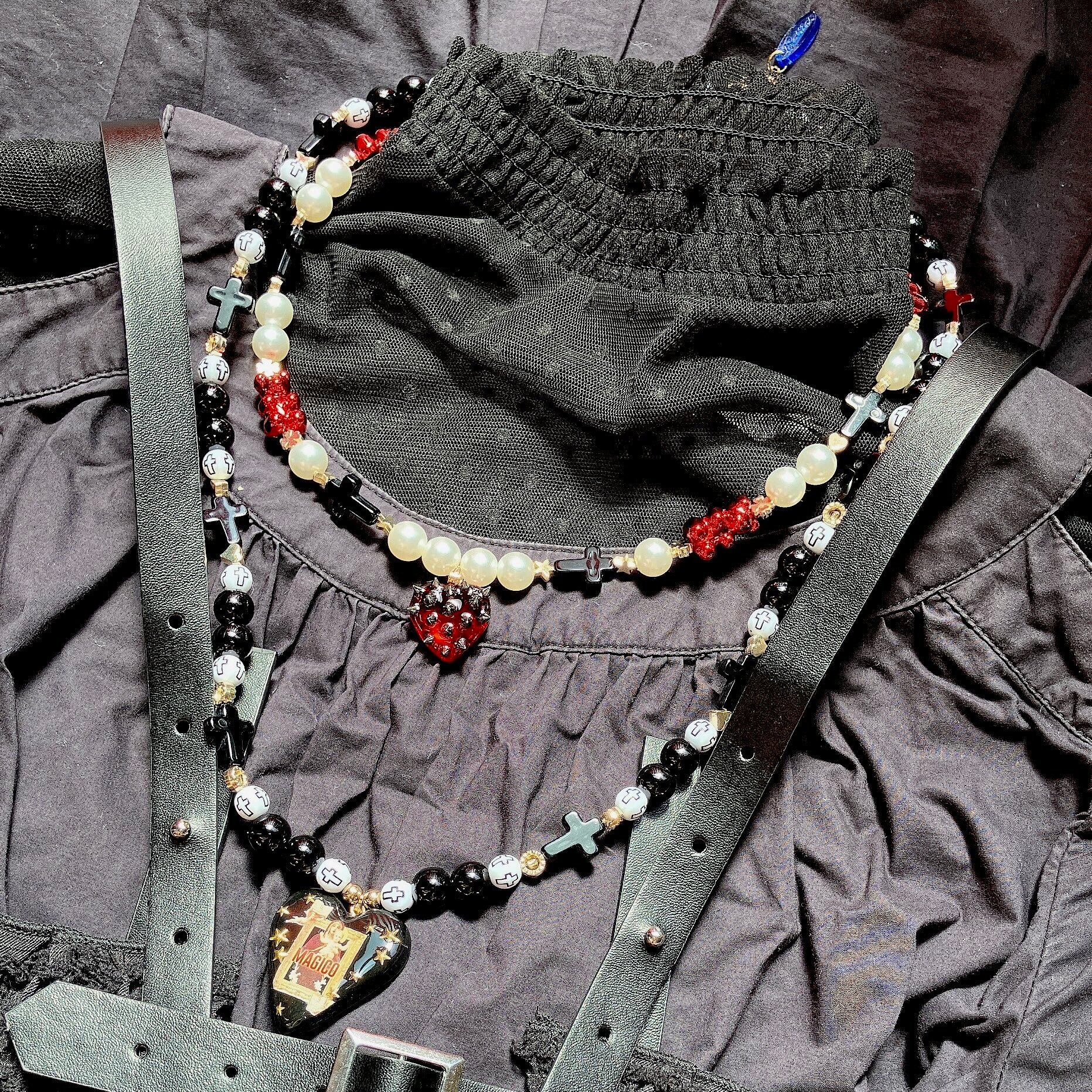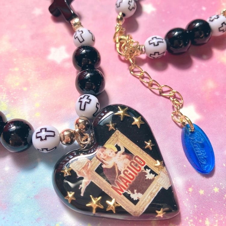 メタルパーツやステッカーを仕込んだ粘土製のハートが揺れるビーズネックレス。