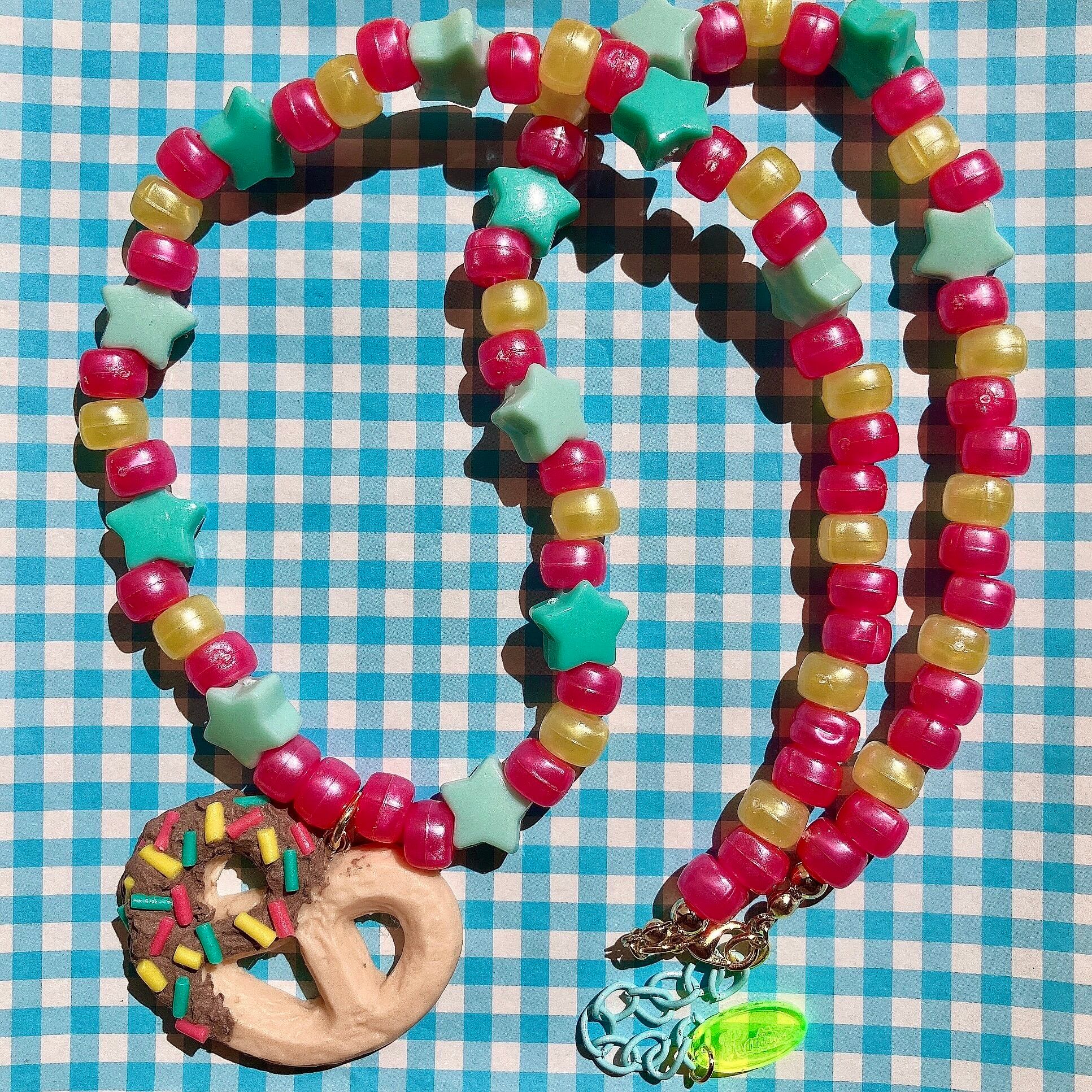 チョコがけプレッツェルが揺れるビーズネックレス。