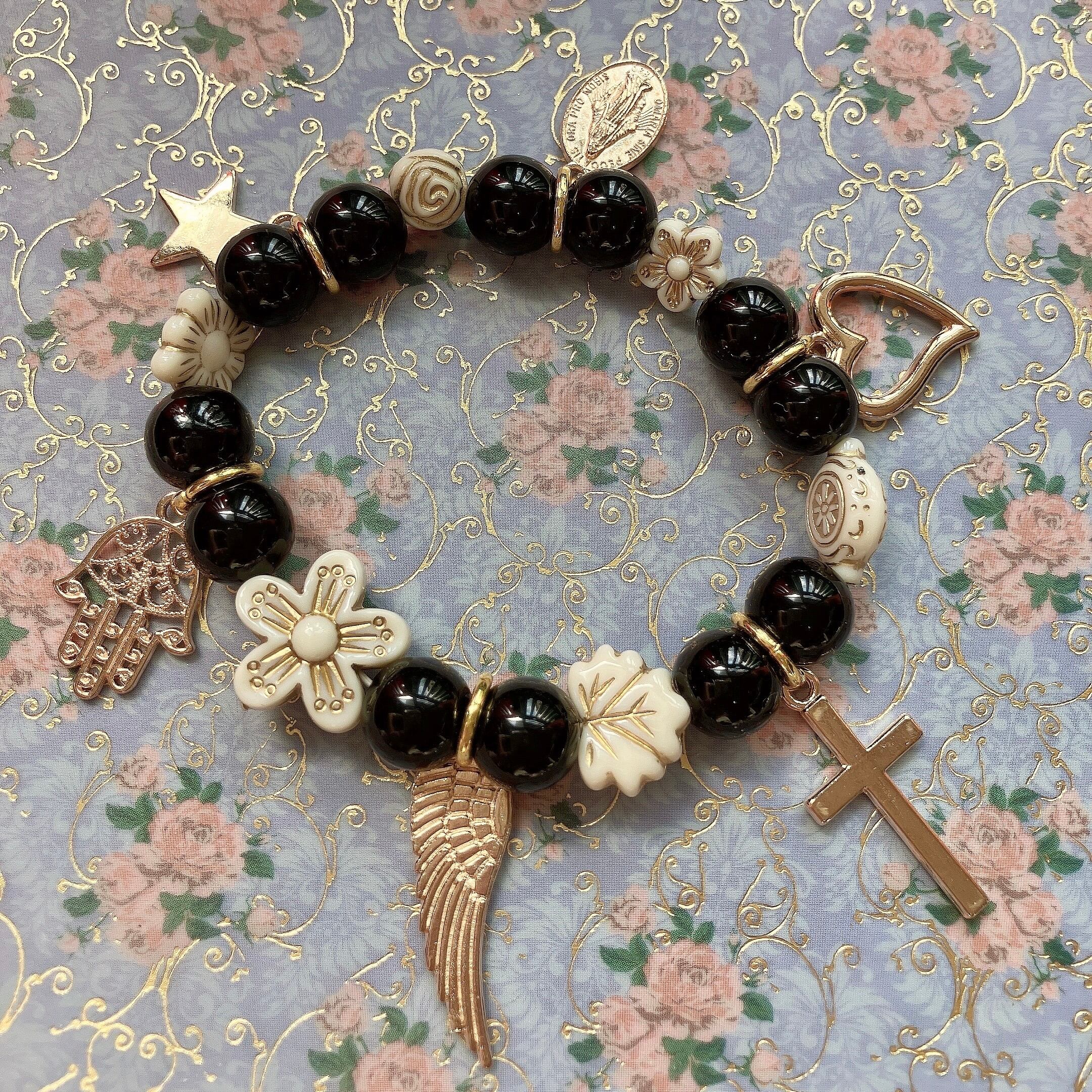 ブラックの10mmボールに、アンティーク調のデザインビーズを挟んだ、モノトーン×ゴールドの秋冬にピッタリなアイテムです。
