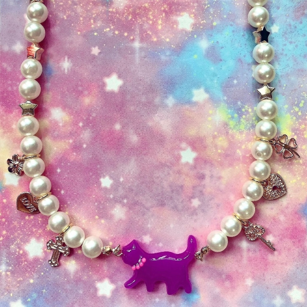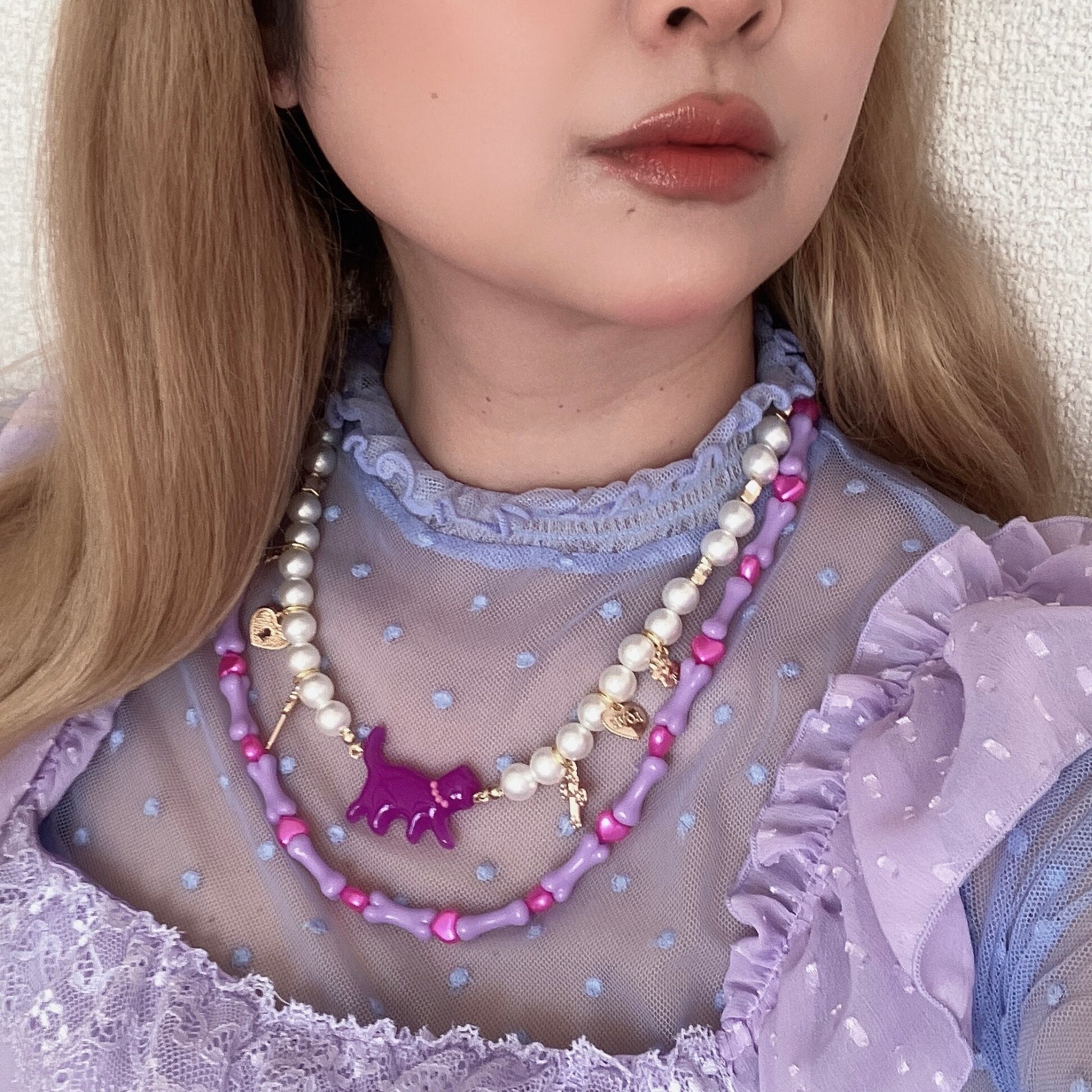 メタルチャームが両サイドに揺れる、10mmパールのネックレスのフロントには、透け感のあるパープルの猫が♥