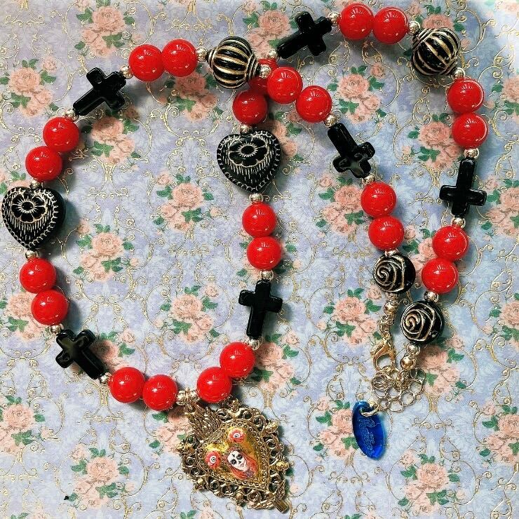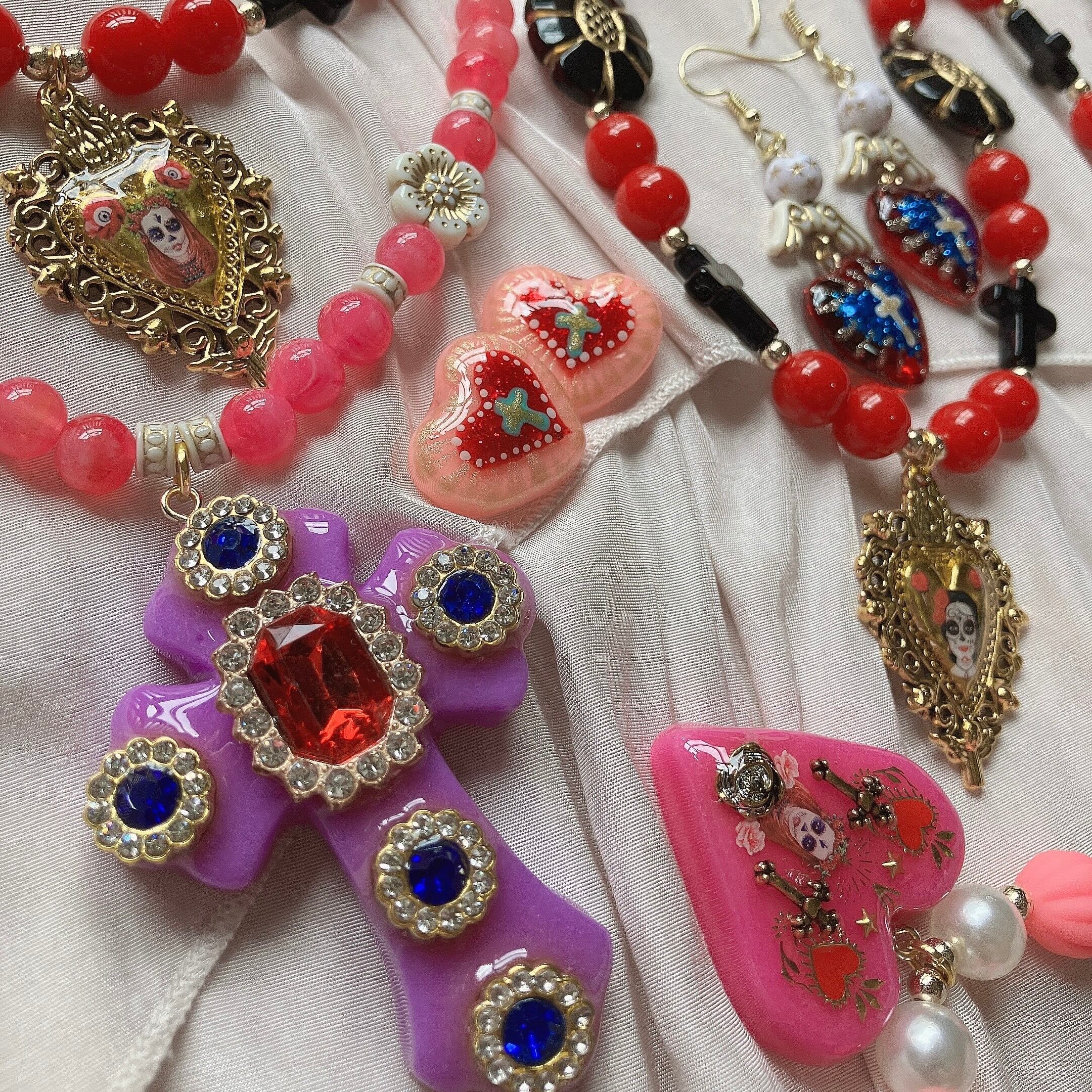 コラソンモチーフのメタルチャームに、カトリーナのステッカーをレジンで埋め込んだペンダントトップが魅力的なデザインです。