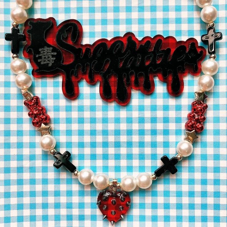 10mmパールにブラックの十字架、メタリックレッドのグミベアを連ねた遊び心あるデザインです。