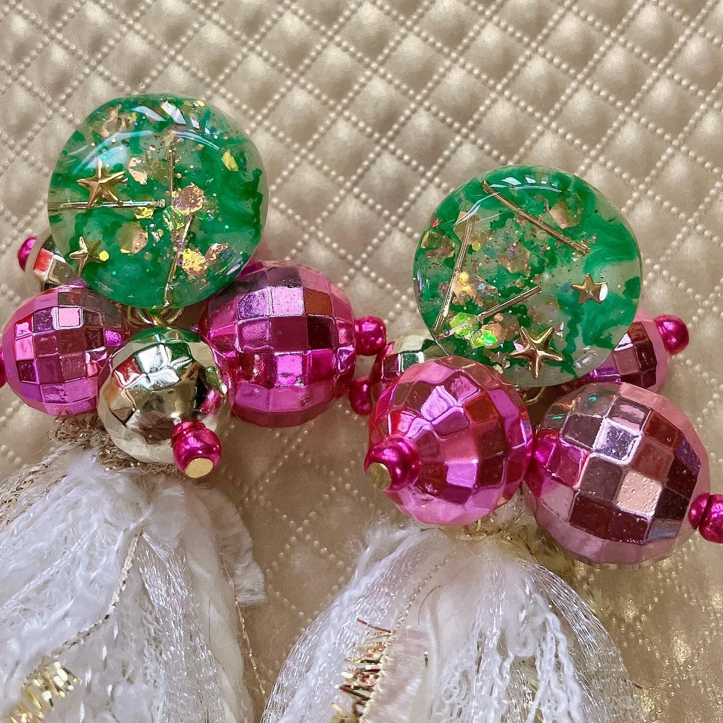 ゴールドラメを加えたミルキーホワイトを背景に、グリーンの糸くずや、星型メタルパーツを閉じ込めたレジンパーツと、引き揃え糸のタッセルチャーム、メタリックカラーのミラーボールのようなビーズが一気にクリスマスムードに☆