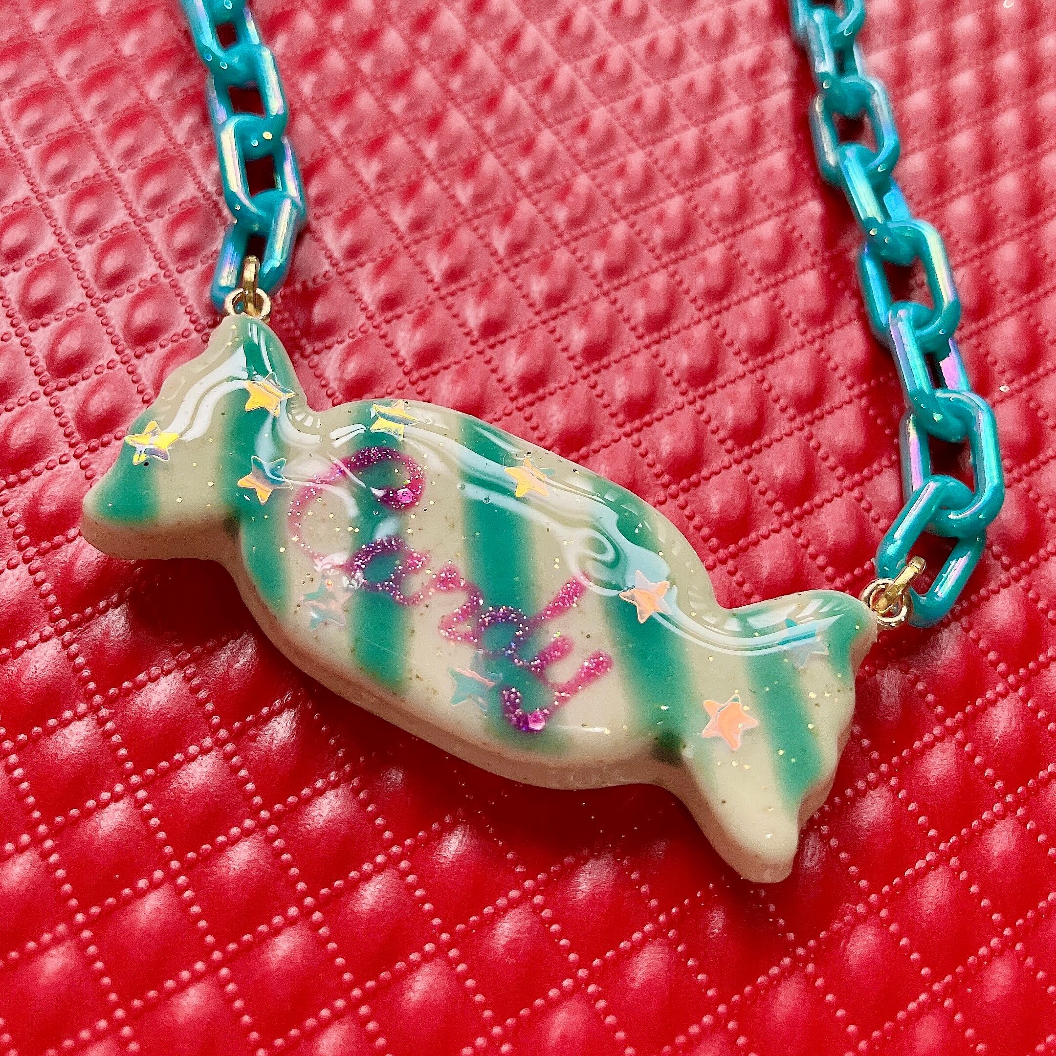 オーロラカラーのプラチェーンにつながれた、ミルクチョコレートのような粘土製のキャンディは、ゴールドラメを練りこんだアイボリーホワイトで、シアーなサックスブルー、レッド、ピンクのグリッターカラーでストライプ模様を描きました。