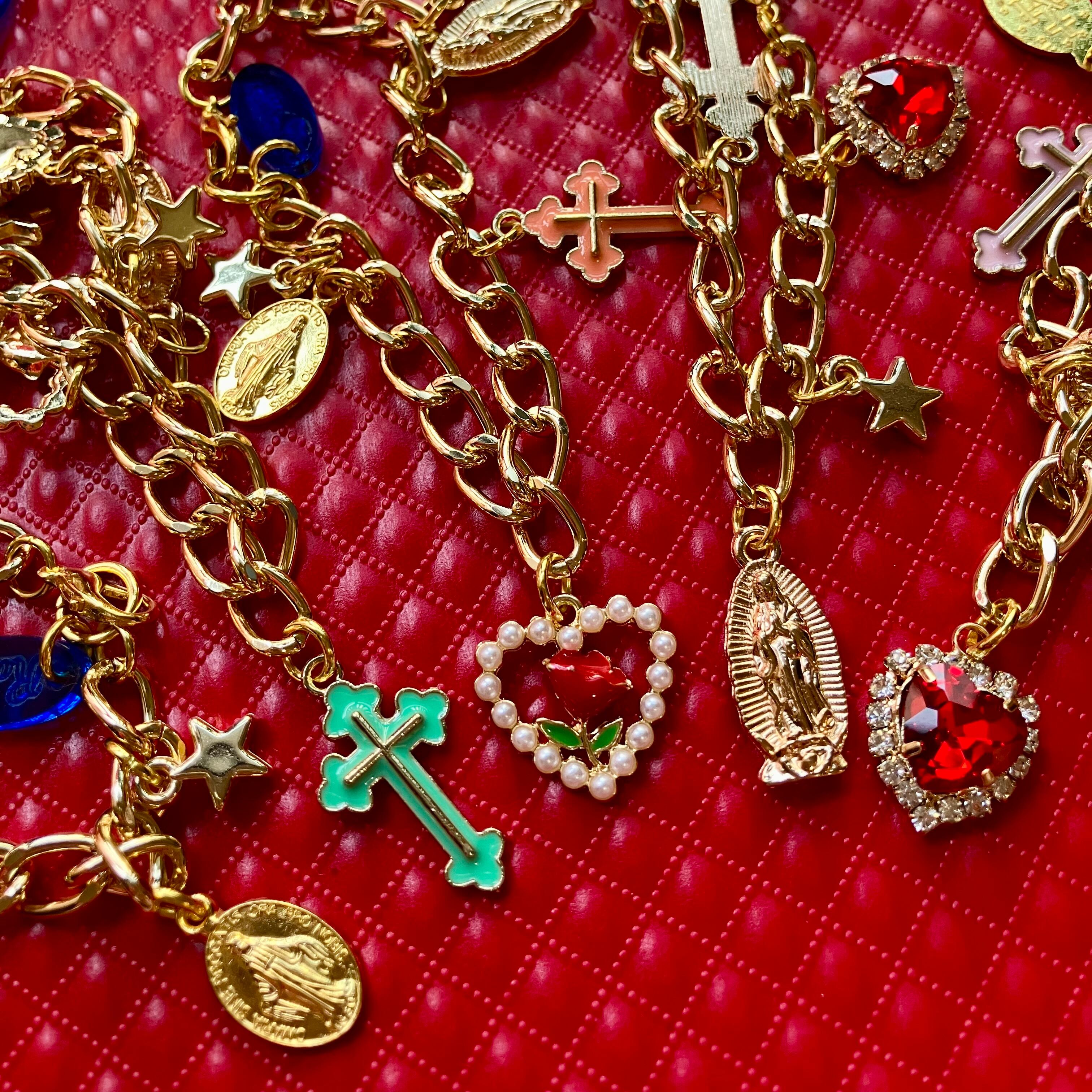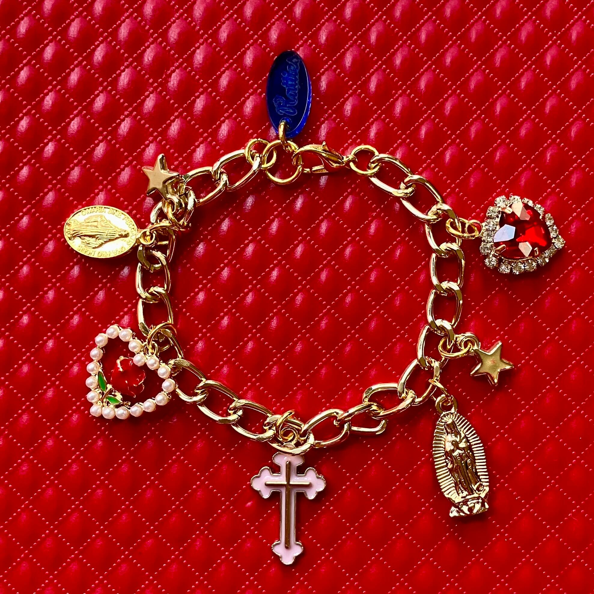 十字架やマリア像、ハートなど7つのチャームが揺れるチャーム付きブレスレット。