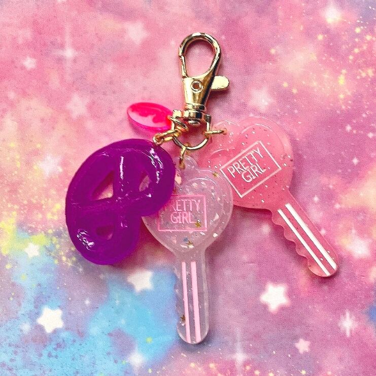 クリアカラーとスケルトンカラーの2種類のハートのキーチャームを添えました。
