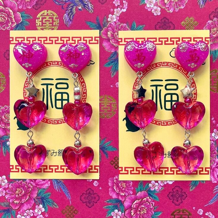 チャイナモチーフの粘土ハートに2粒の多面カットハートビーズが連なる耳飾り。
