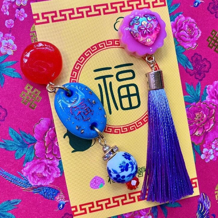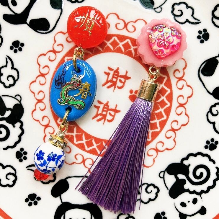 透け感ある赤の粘土パーツ、龍神デザインの粘土パーツ(裏面は福の文字)、シノワズリなボールビーズを繋いだものと、砂糖菓子のような粘土パーツにタッセルを繋いだもののペアとなります。
