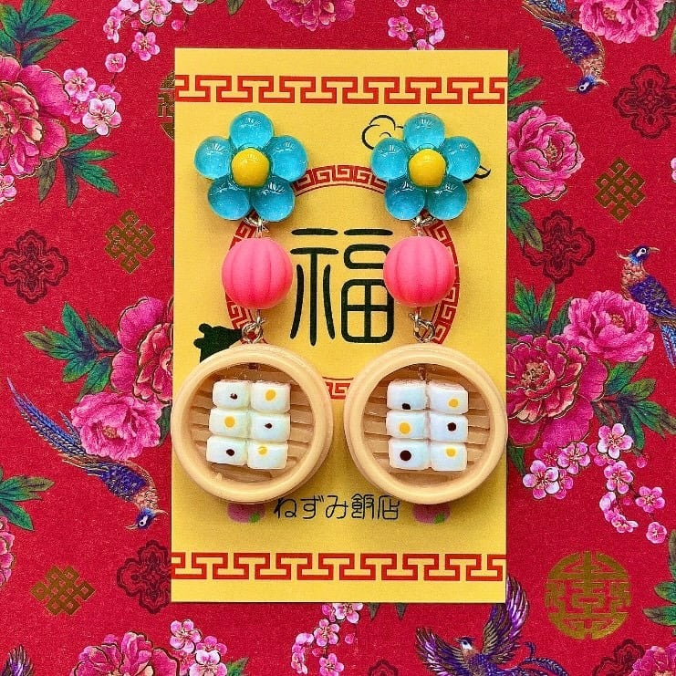 ミニチュアの蒸籠に入った点心が遊び心満載な耳飾りです。