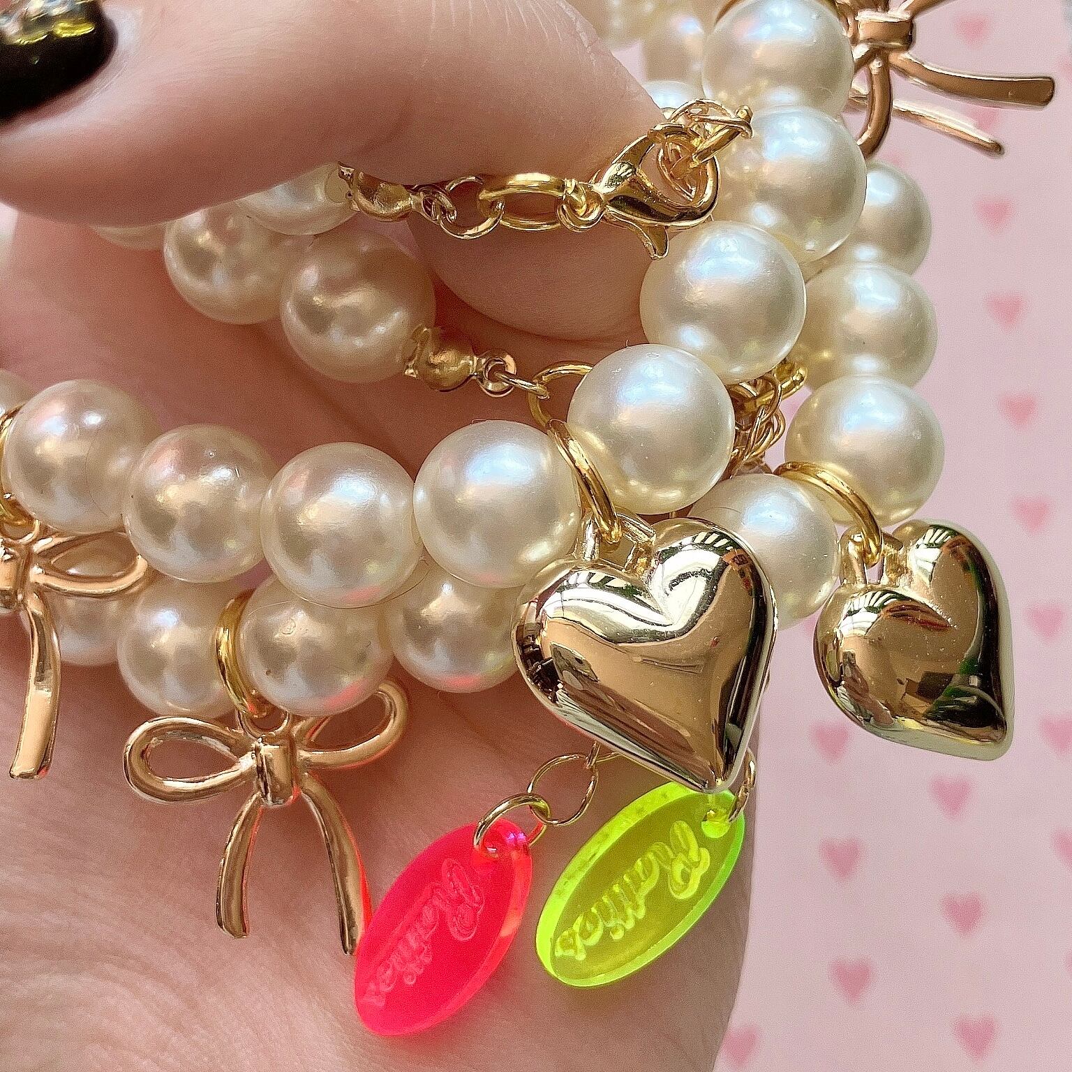 ハートチャームを真ん中に、両サイドにリボンチャームを配置した10mmパールのネックレス。