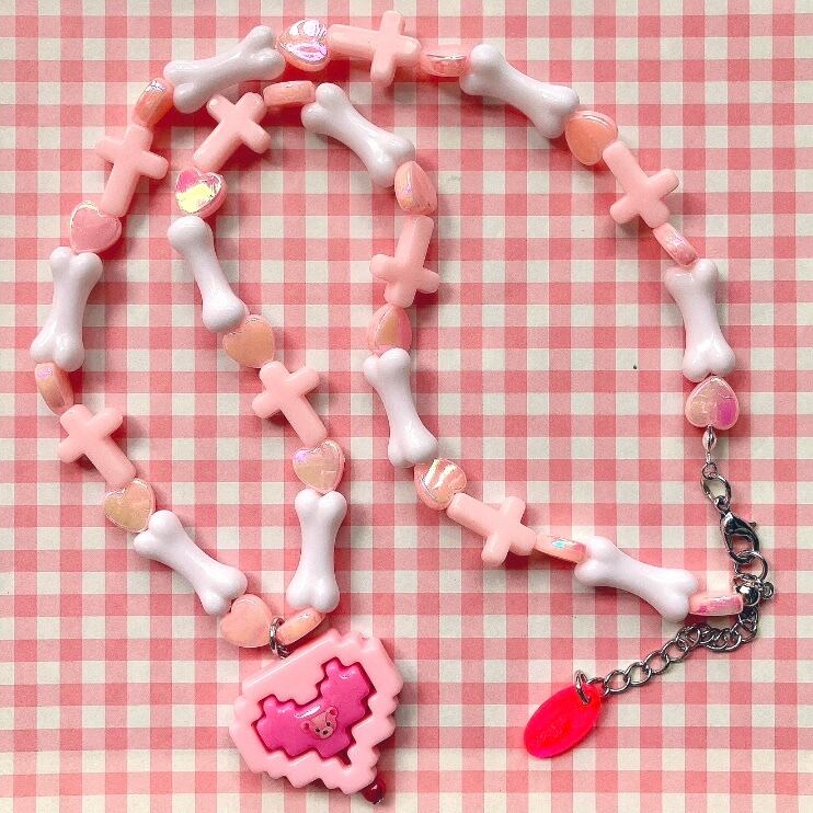 骨型ビーズに十字架とハートを挟んだビーズネックレス。