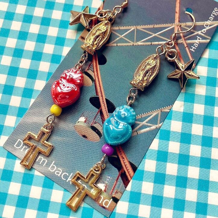グアダルーペのメタルビーズ、コラソンのセラミックビーズ、十字架フレームのメタルチャームを連ねたメキシカンテイストなピアス/イヤリング。