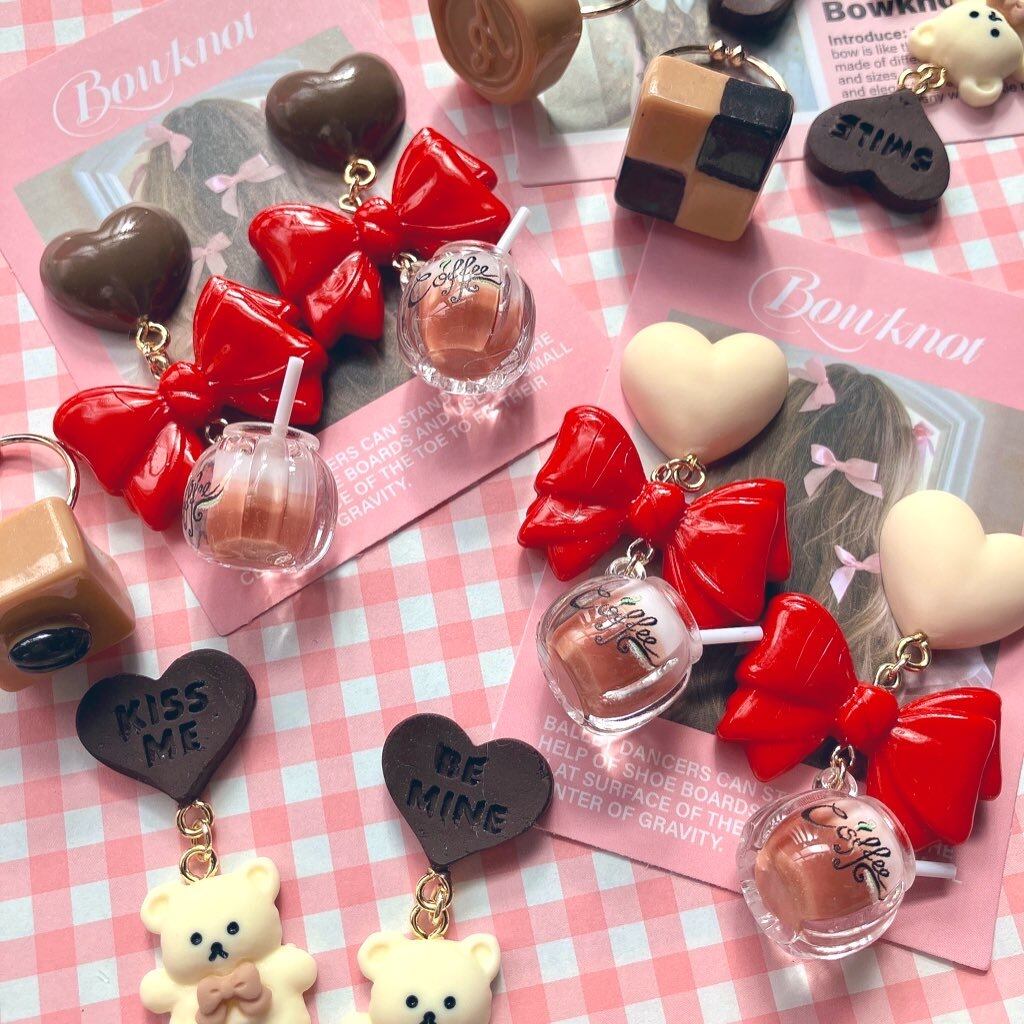 チョコレートのようなハートとカフェラテを真っ赤なリボンで繋いだピアス/イヤリング。