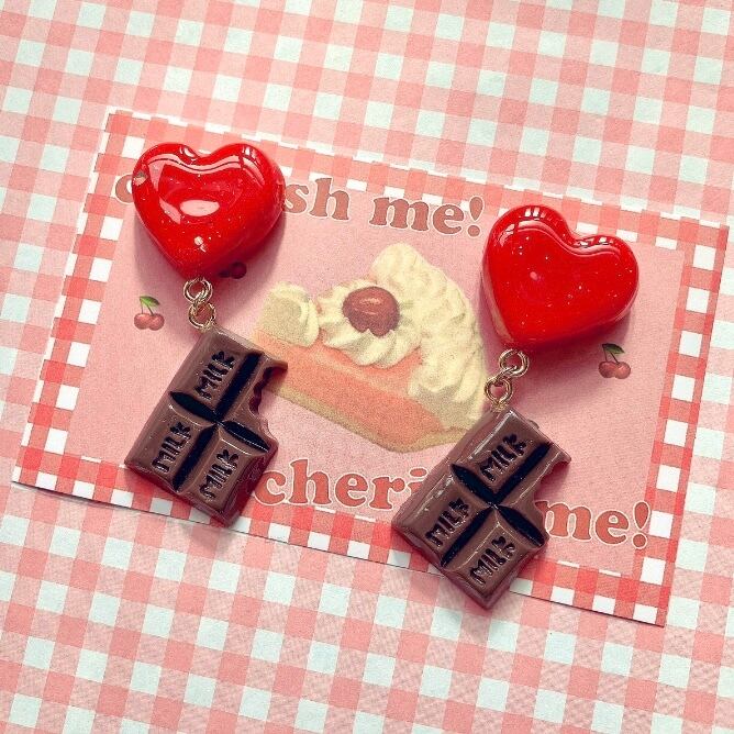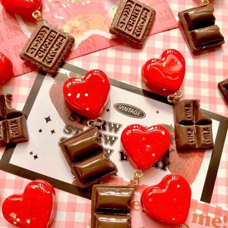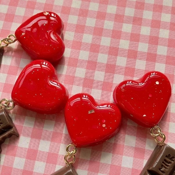 ゴールドのホログラムラメを練り込んだ真っ赤なハートに、齧りかけのミルクチョコレートが揺れ動きます。