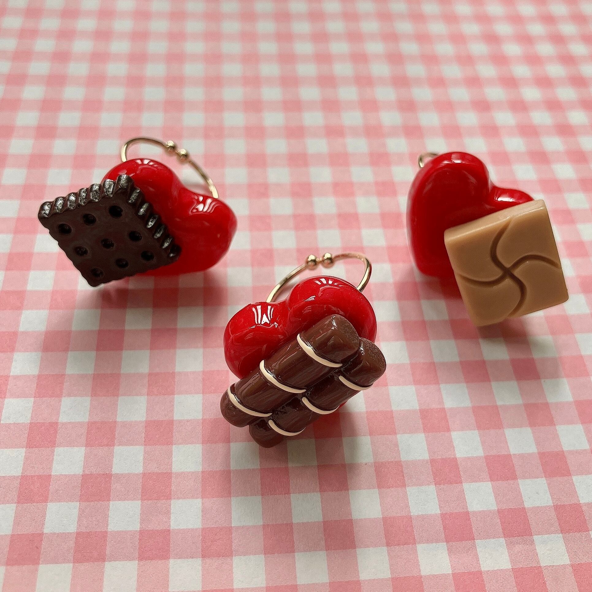 赤い粘土製ハートにチョコレートなどのパーツを付けたバレンタイン気分満載なリング。