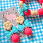 オーロライエローのお花、水色のリボン、ネオンピンクの16mmボールが連なるピアス/イヤリング。