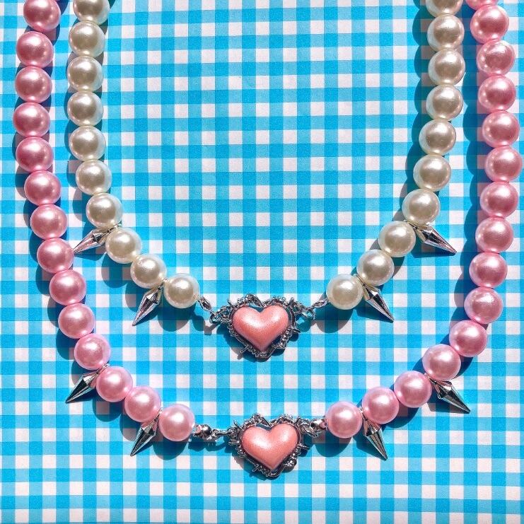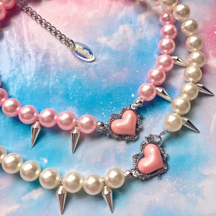 有刺鉄線で囲まれたハートのトップとトゲトゲチャームのパールネックレス。