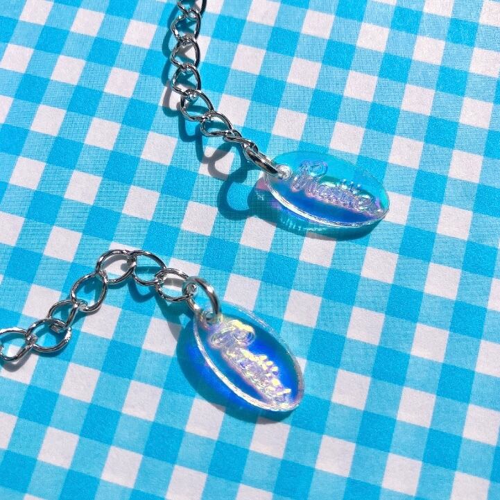 アジャスターチャームのオリジナルブランドタグは、初のオーロラクリアを使用しております。