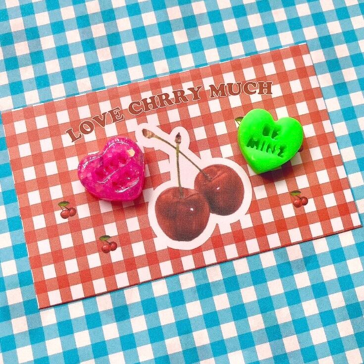 型押しメッセージが入った粘土で出来たハートのピアス/イヤリング。