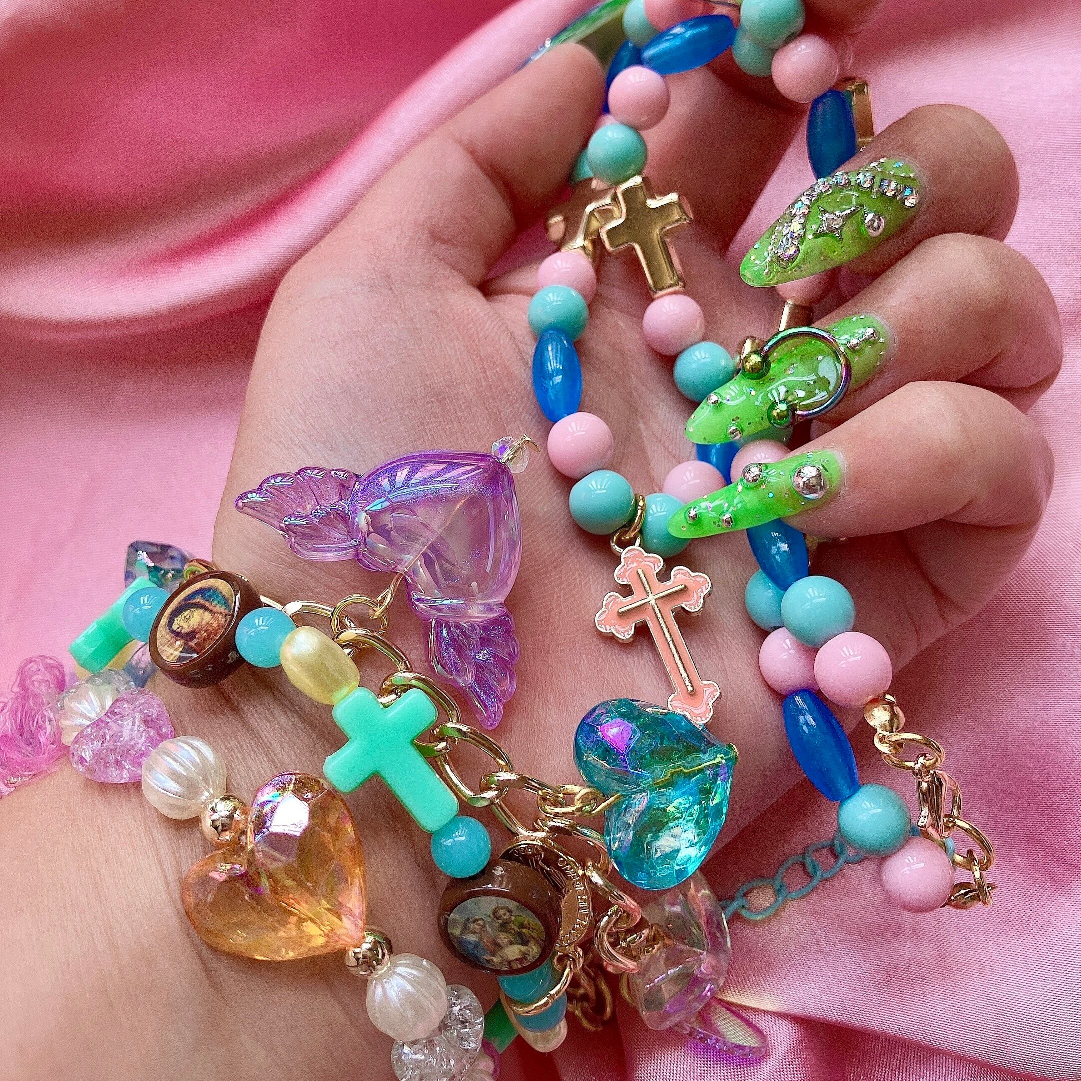 クリア、サックス、パープルのハートはそれぞれオーロラ加工されており、大粒な煌めきが魅力的♡