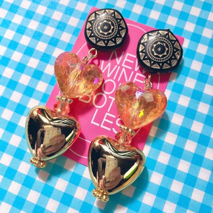 民族調なデザインビーズにオーロラクリアカラーの多角ハート、つるんとしたメタリックハートが揺れるイヤーアクセサリー。