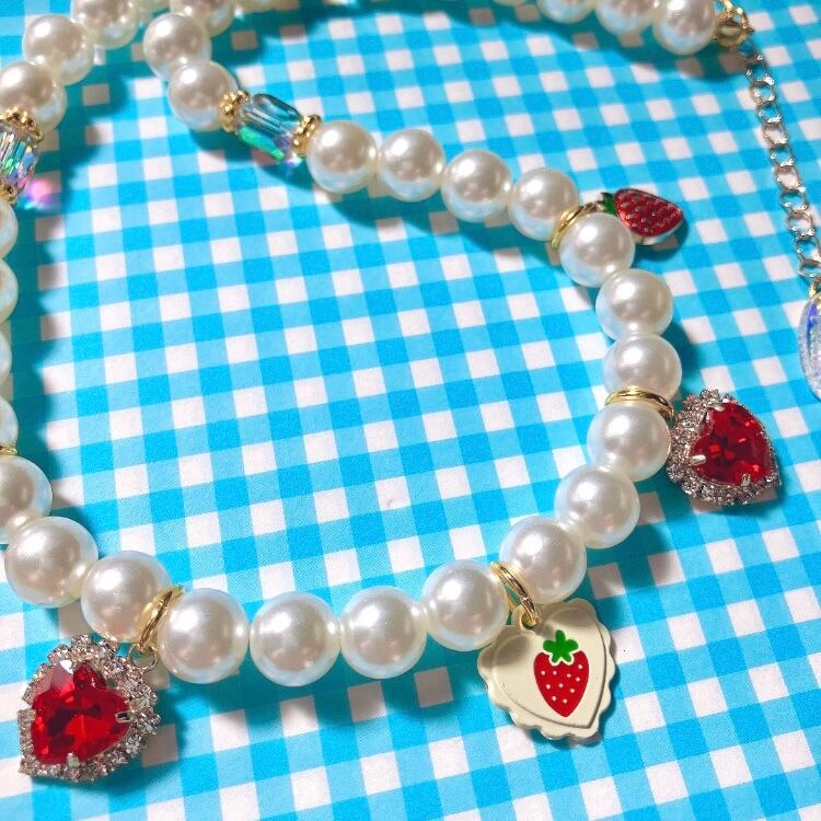 10mmパールに2種類の苺のチャームとハートのストーンチャームを配置しました。