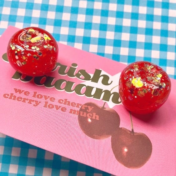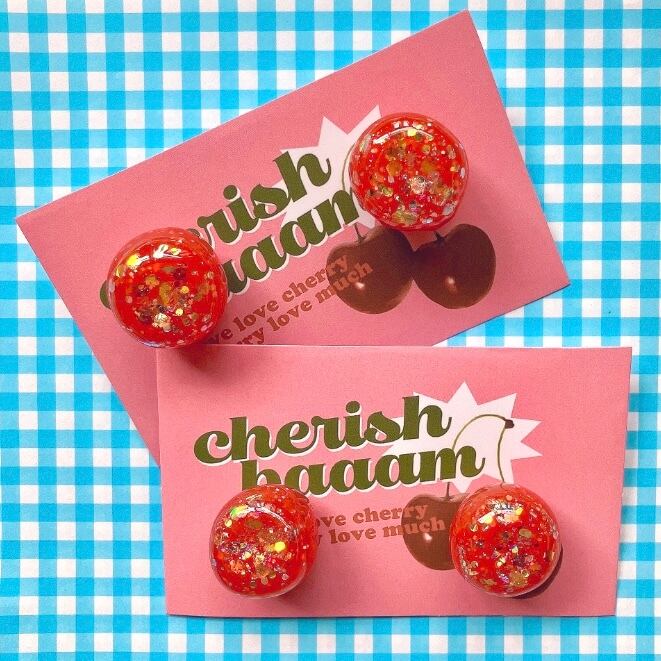 透け感のある粘土製のチェリーは、完全な丸型ではなくくぼみがあるのが特徴で、ホログラムやラメを散らしレジンでコーティングしております。