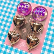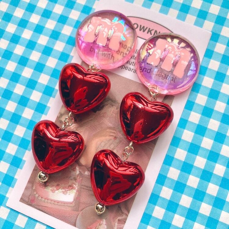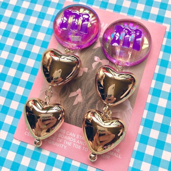 ビッグサイズのmロゴパーツに二連のメタリックハートが揺れるイヤーアクセサリー。