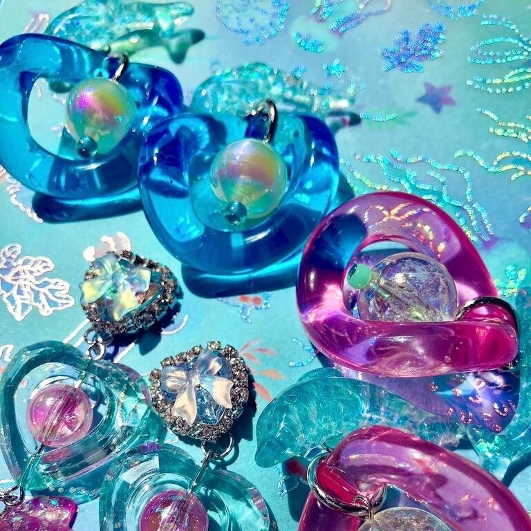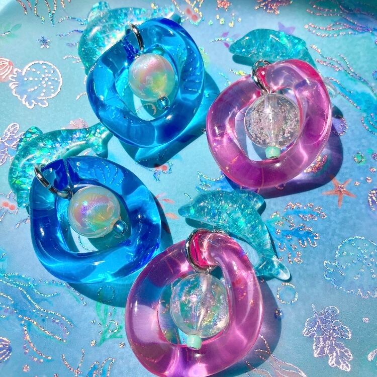 きらきらのイルカにドイツ製プラスチックチェーンを繋げたイヤーアクセサリー。
