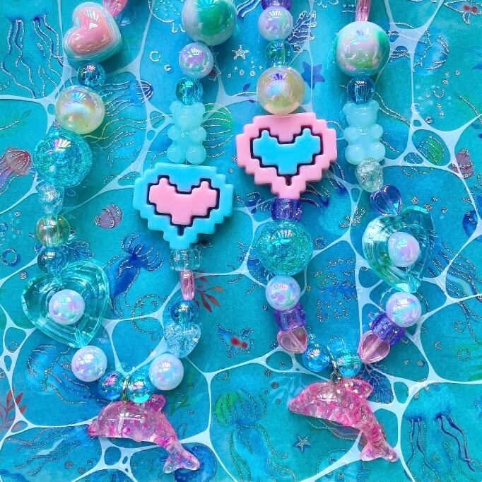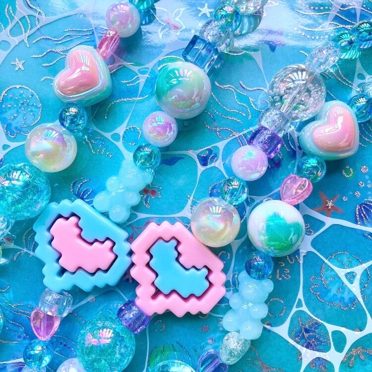 クリア、ラメ、オーロラ、いろんなきらきらビーズを集めて涼し気な配色でお作りしました。