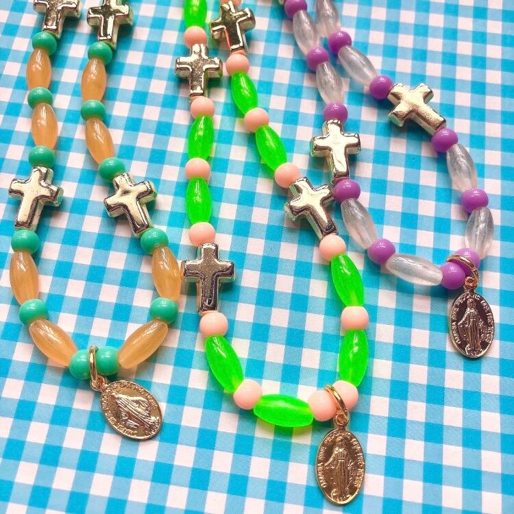夏らしい配色の細長い蓄光アクリルビーズと6mmカラーボールに、メタリックゴールドの十字架ビーズを挟みました。