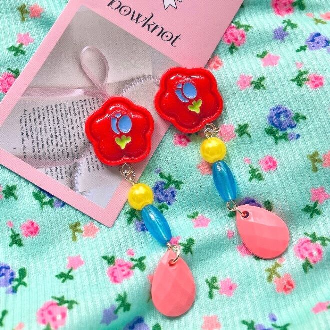 チューリップ柄のカボションに、ビーズを連ねたイヤーアクセサリー。