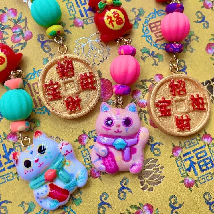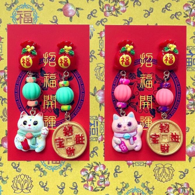 福巾着に愛らしい招き猫や【宝進財招】の文字が入った硬貨が揺れる耳飾り。