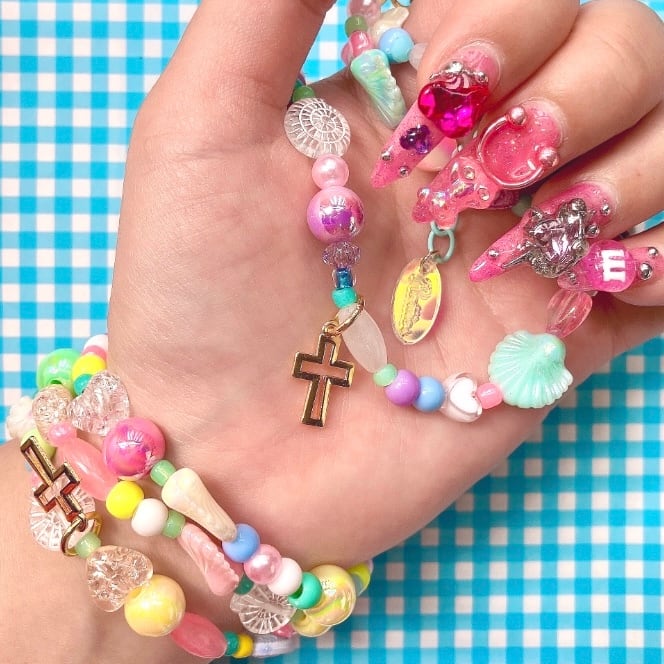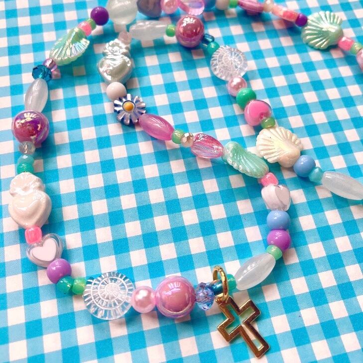 パステルカラーを基調とした十字架チャームのビーズネックレス。
